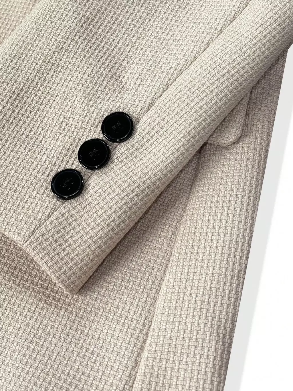 A gola lapela e o caimento regular valorizam a silhueta masculina, garantindo versatilidade para uso durante as estações de primavera e outono, especialmente em temperaturas entre 10°C e 17°C.