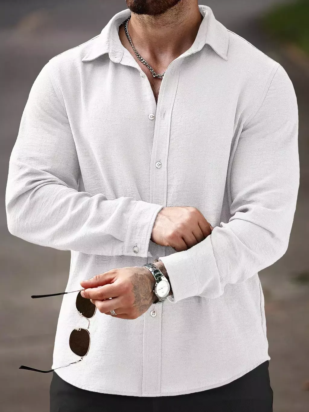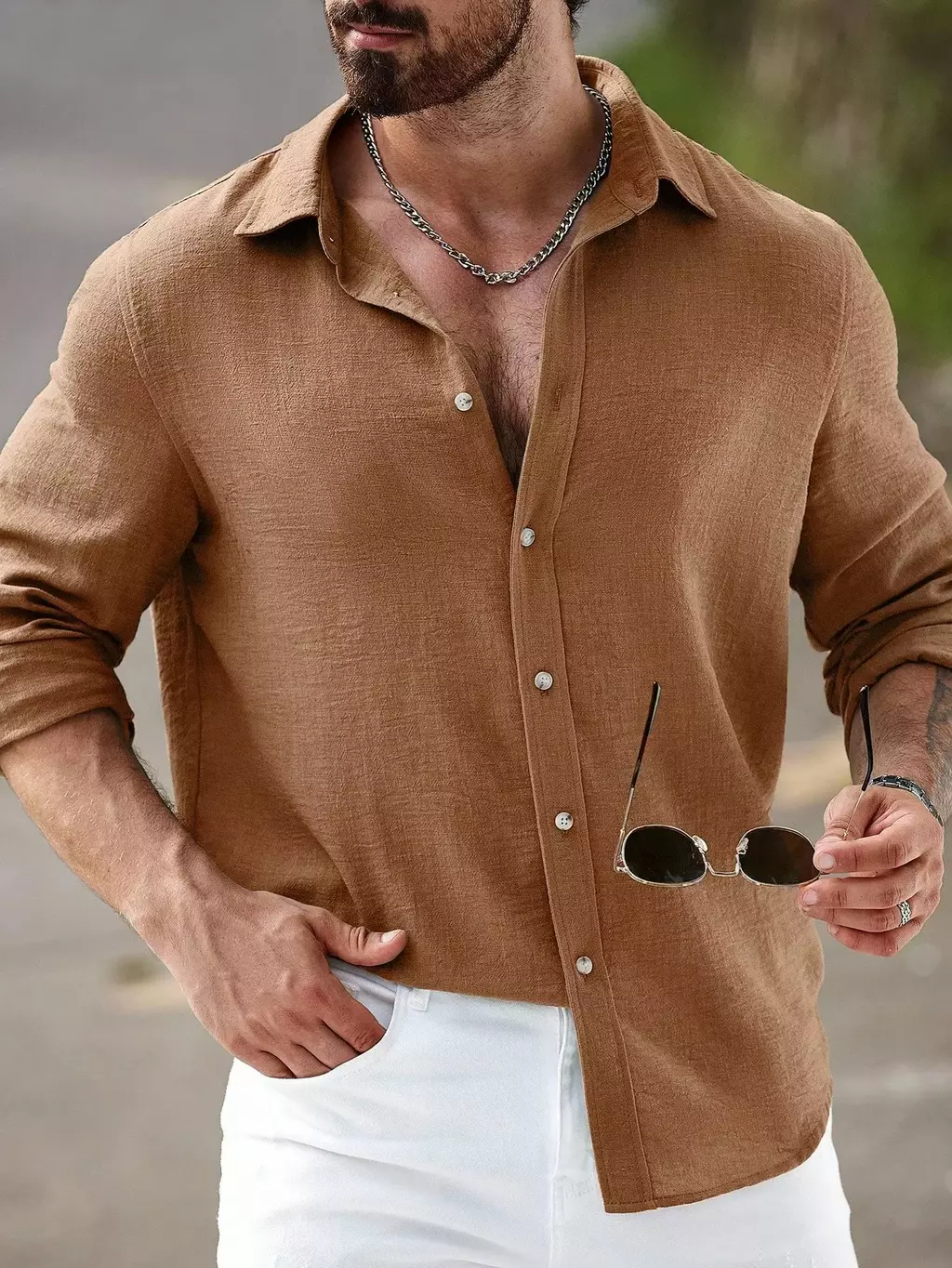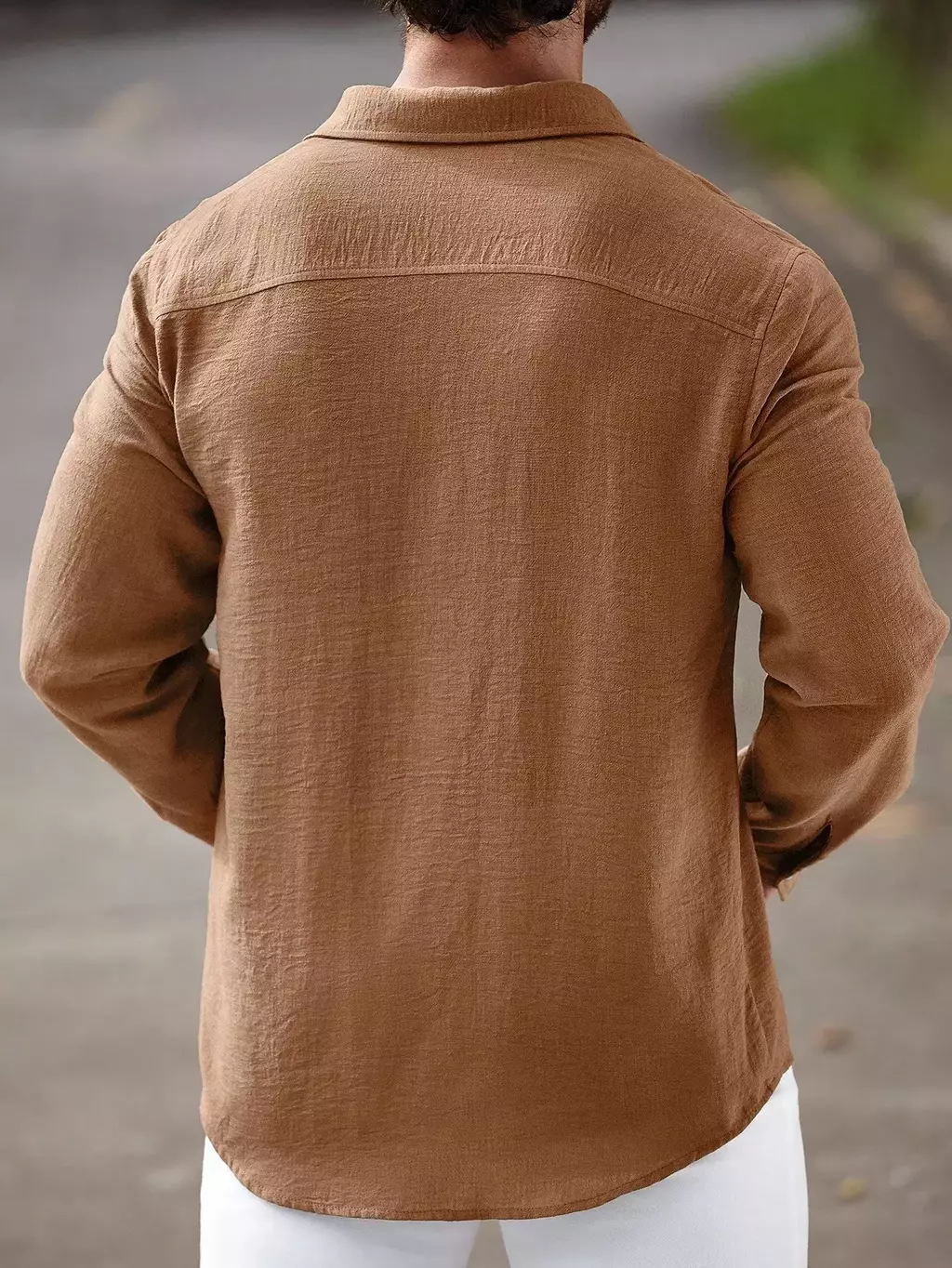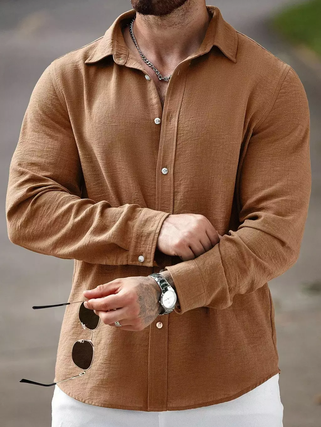 Camisa Masculina Manfinity CasualCool Linho Outono – Manga Longa, Gola Lisa