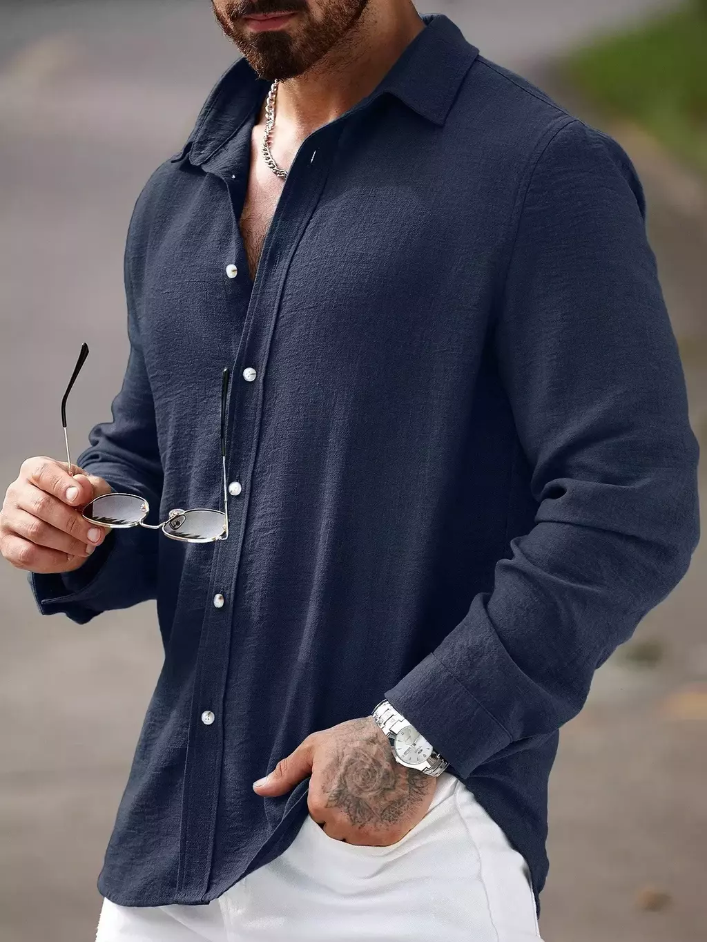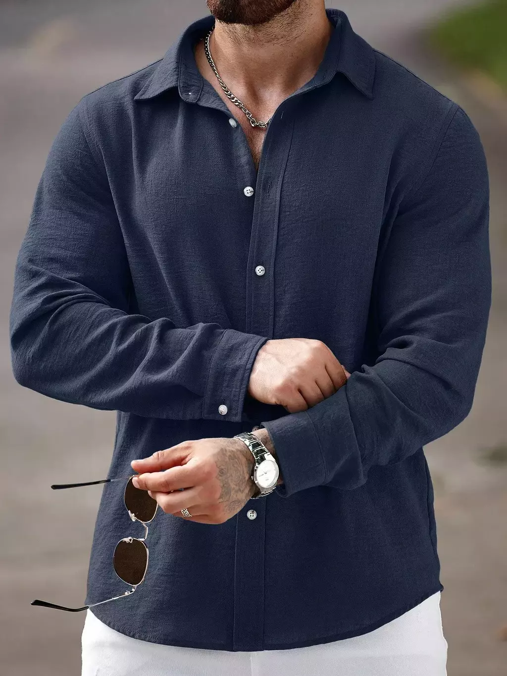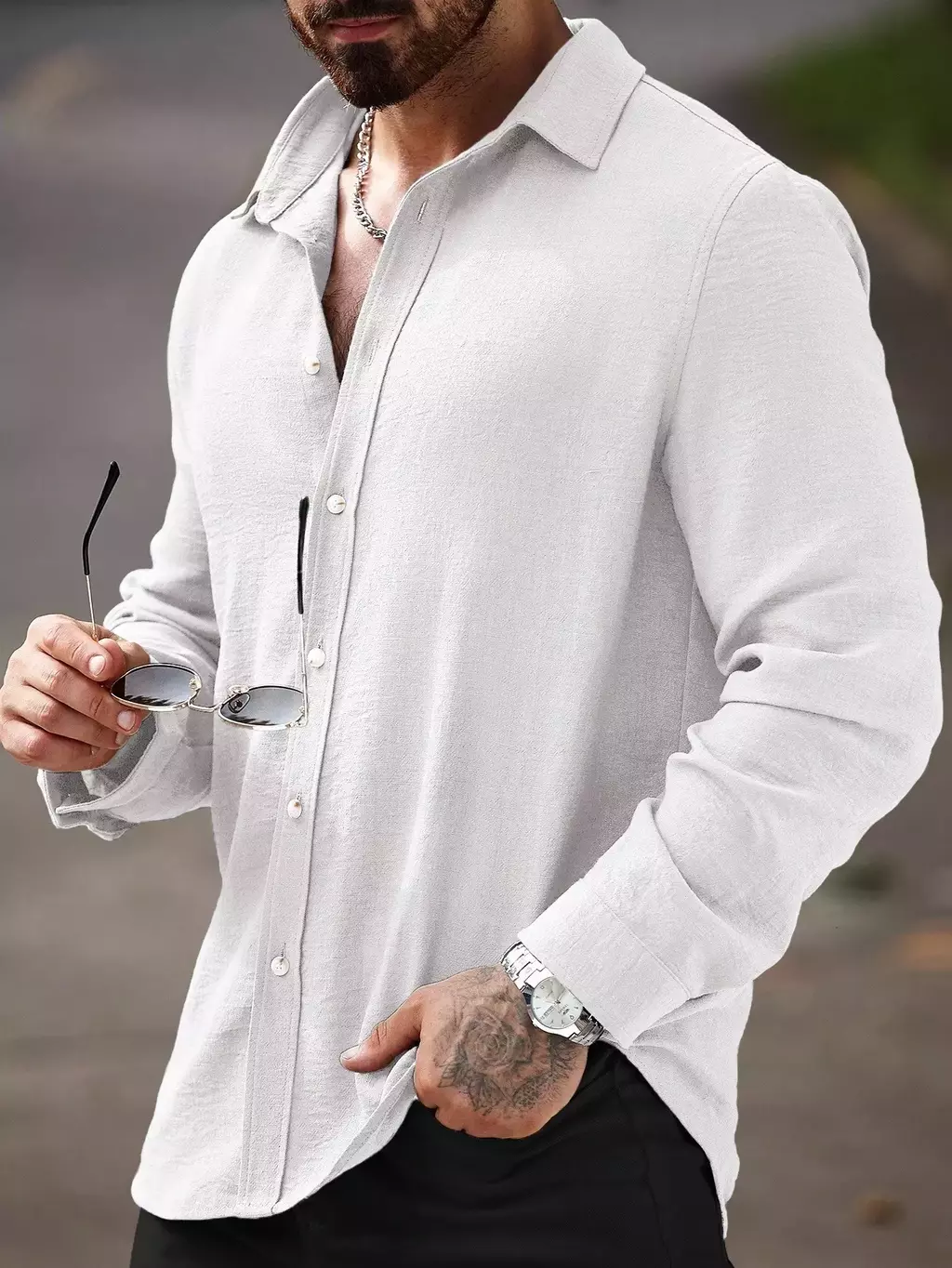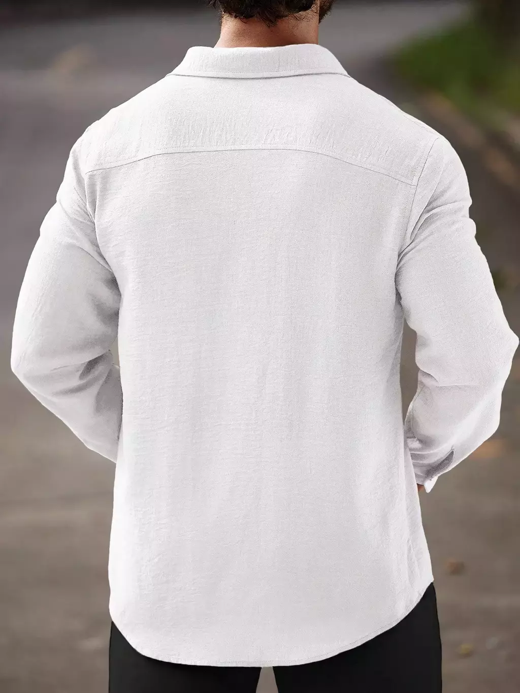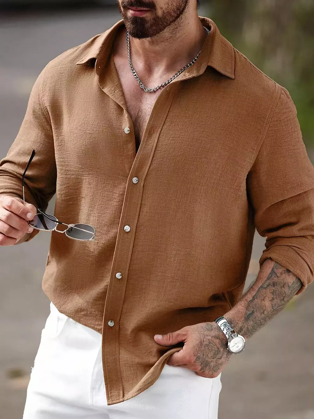 Camisa Masculina Manfinity CasualCool Linho Outono – Manga Longa, Gola Lisa