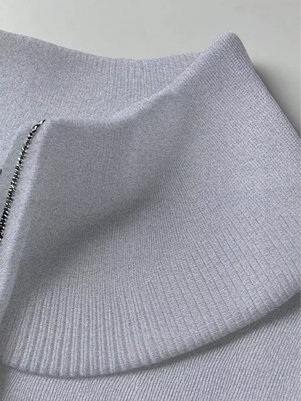 Confeccionado em lã penteada com composição de 66% viscose e 34% poliéster, oferece toque macio, leve elasticidade e excelente caimento. A peça apresenta mangas longas com ombro caído, gola alta com variação de lapela e um zíper frontal funcional, que adiciona um toque moderno ao visual.