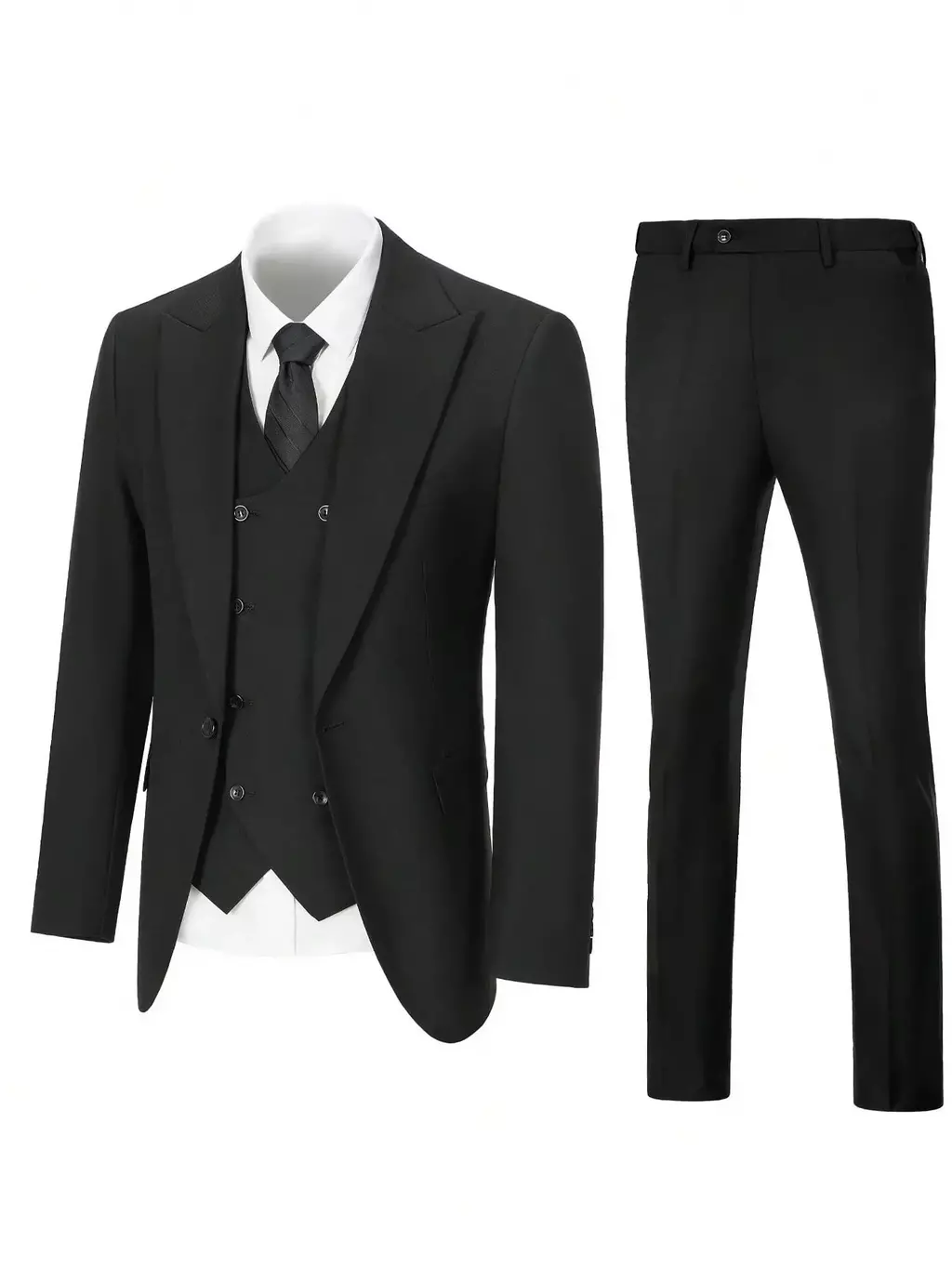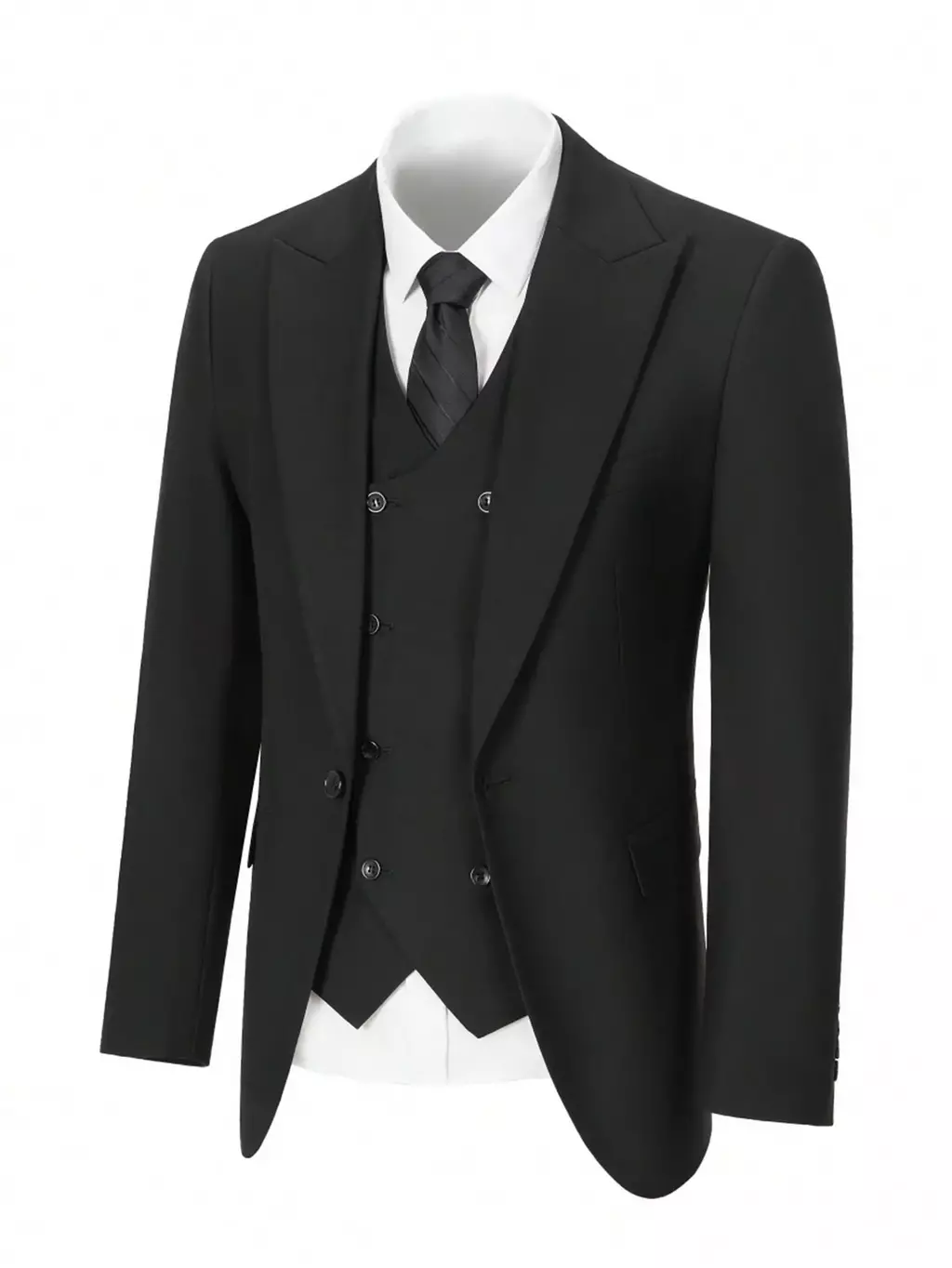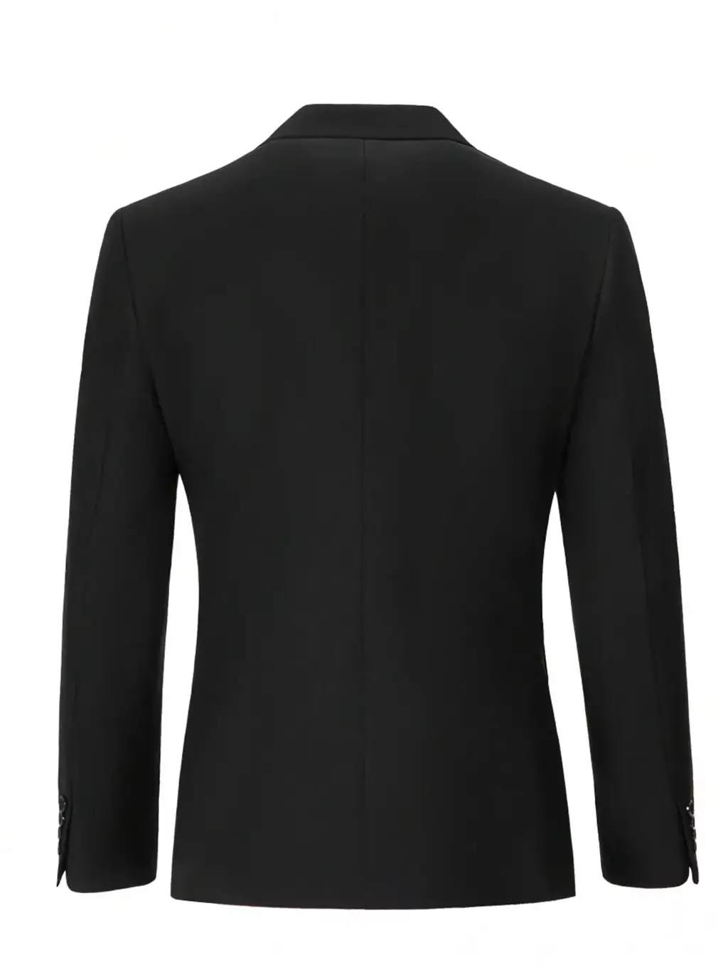 O blazer com gola de xale e botão único oferece um visual elegante e contemporâneo, enquanto o colete de abotoamento duplo adiciona um toque clássico e distinto. As calças com caimento ajustado completam o conjunto, proporcionando uma silhueta moderna e alinhada.