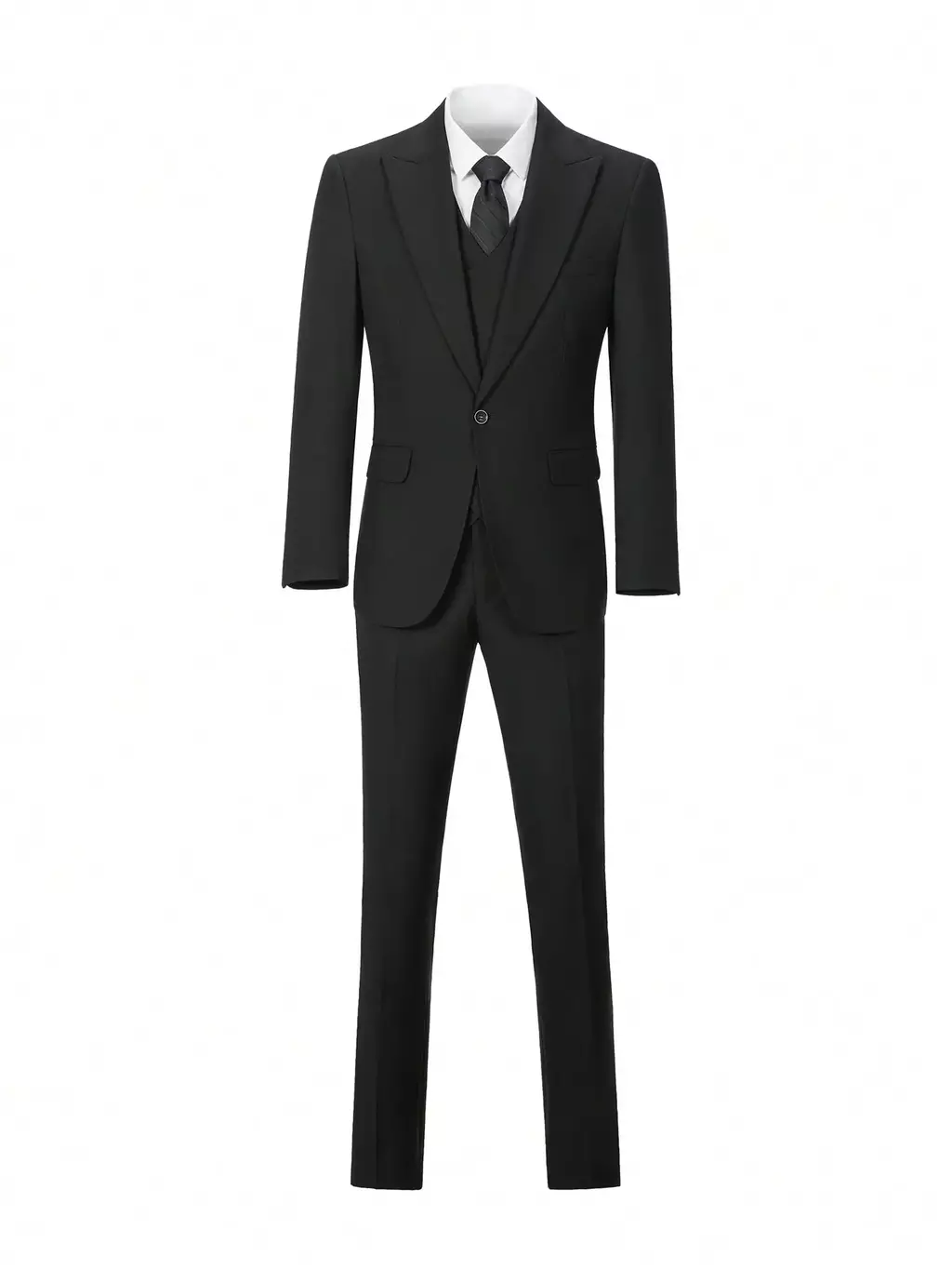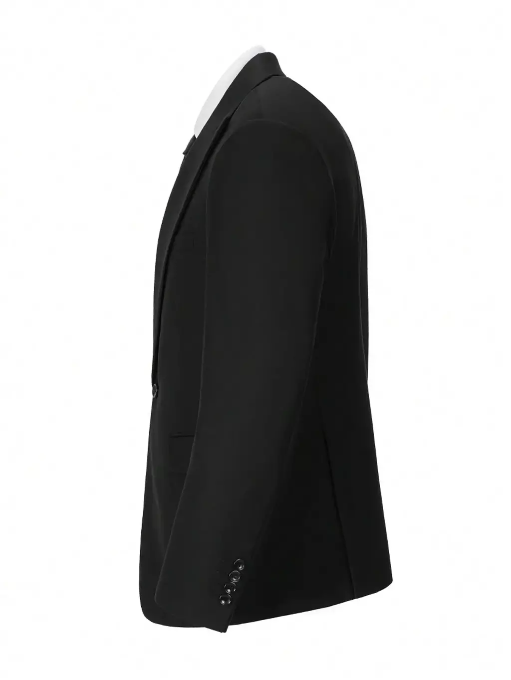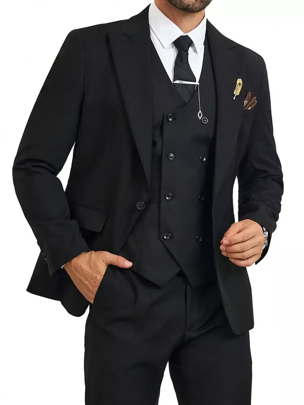 O blazer com gola de xale e botão único oferece um visual elegante e contemporâneo, enquanto o colete de abotoamento duplo adiciona um toque clássico e distinto. As calças com caimento ajustado completam o conjunto, proporcionando uma silhueta moderna e alinhada.